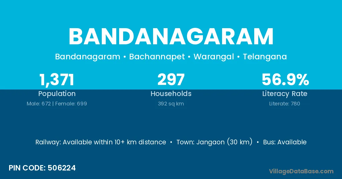 Jangaon (30 km) is the nearest town to Bandanagaram village for major economic activities and is located approximately 30 km away.