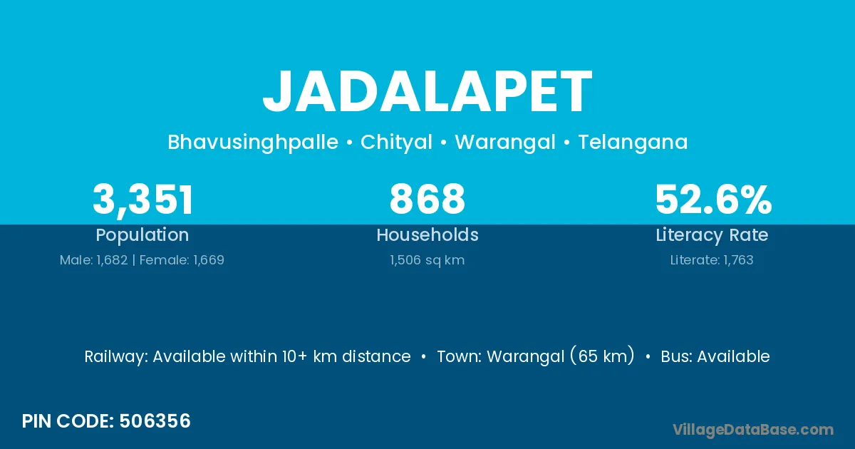 Warangal (65 km) is the nearest town to Jadalapet village for major economic activities and is located approximately 65 km away.