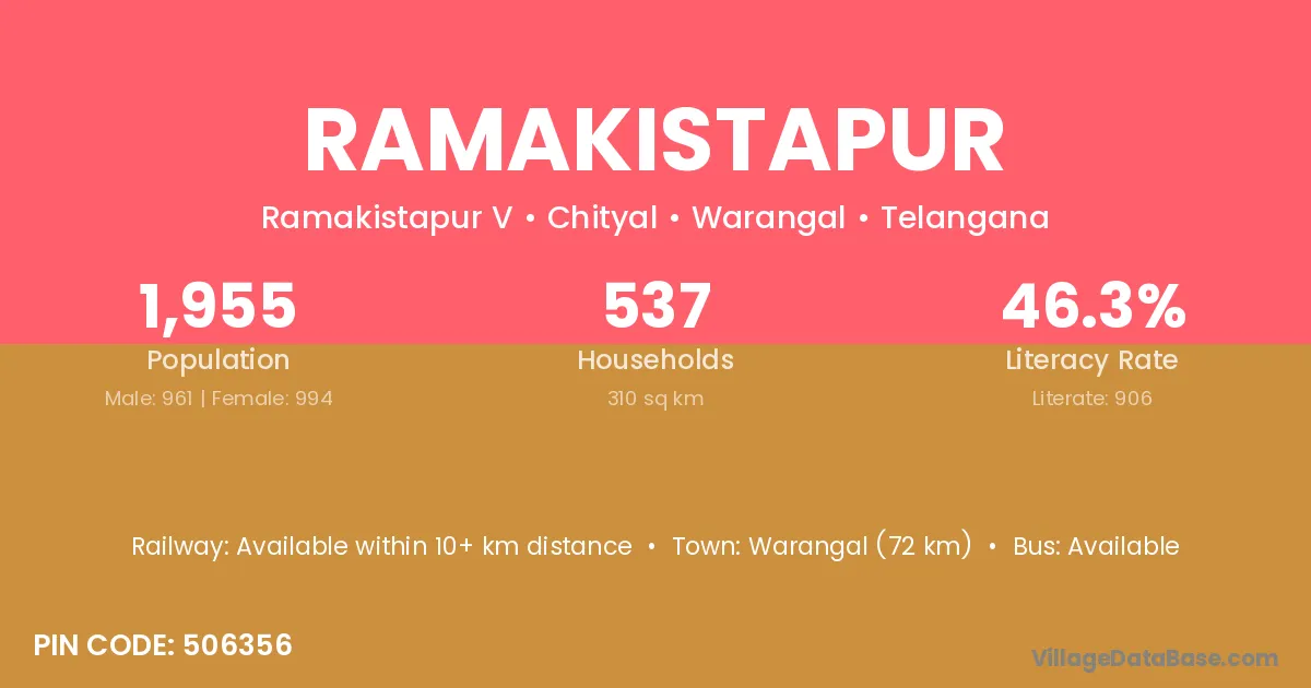 Warangal (72 km) is the nearest town to Ramakistapur village for major economic activities and is located approximately 72 km away.