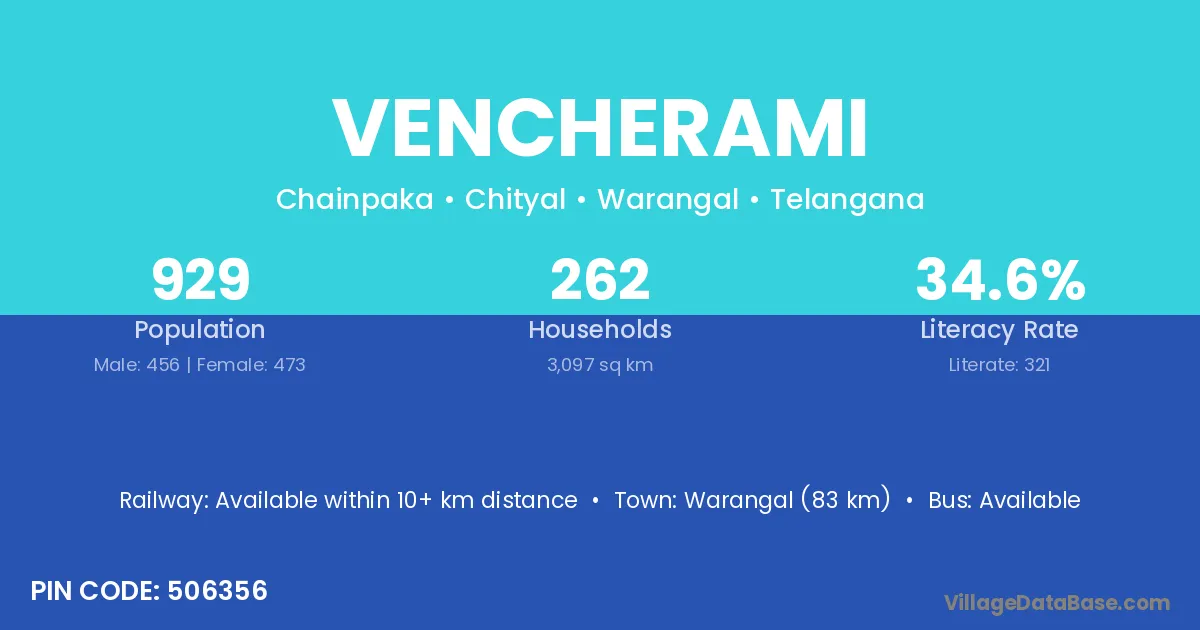 Warangal (83 km) is the nearest town to Vencherami village for major economic activities and is located approximately 83 km away.