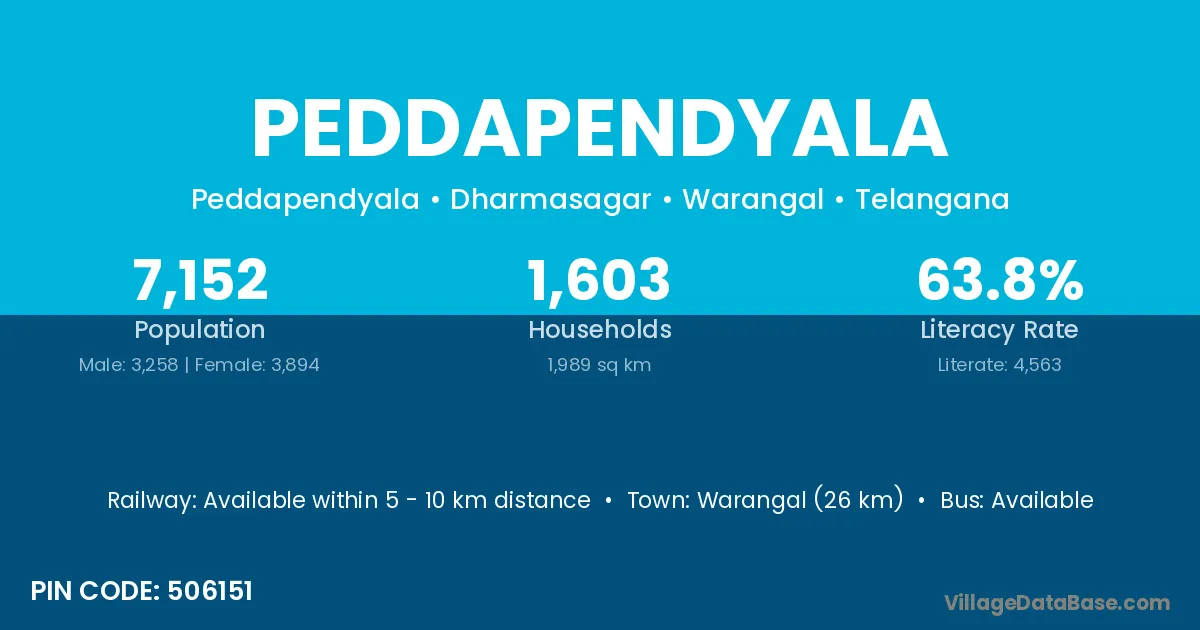 Warangal (26 km) is the nearest town to Peddapendyala village for major economic activities and is located approximately 26 km away.