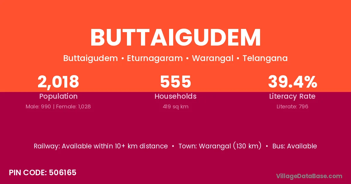 Warangal (130 km) is the nearest town to Buttaigudem village for major economic activities and is located approximately 130 km away.