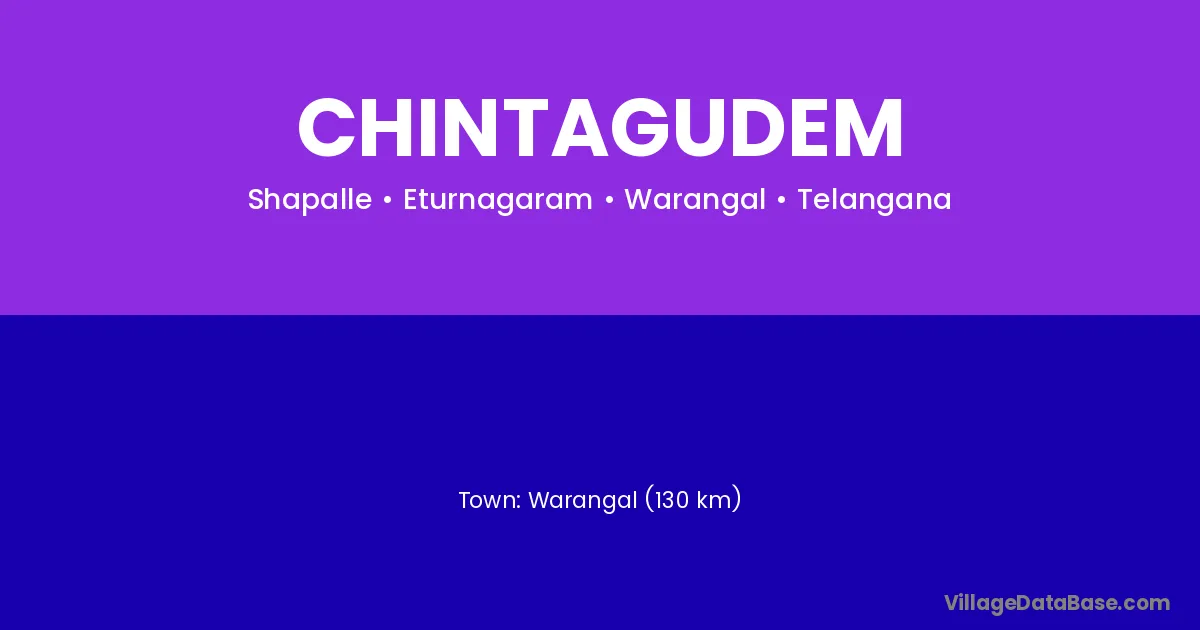 Warangal (130 km) is the nearest town to Chintagudem village for major economic activities and is located approximately 130 km away.