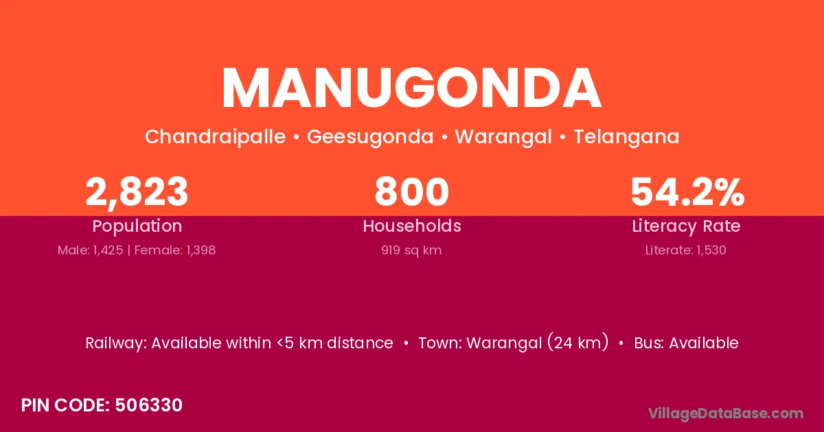 Warangal (24 km) is the nearest town to Manugonda village for major economic activities and is located approximately 24 km away.