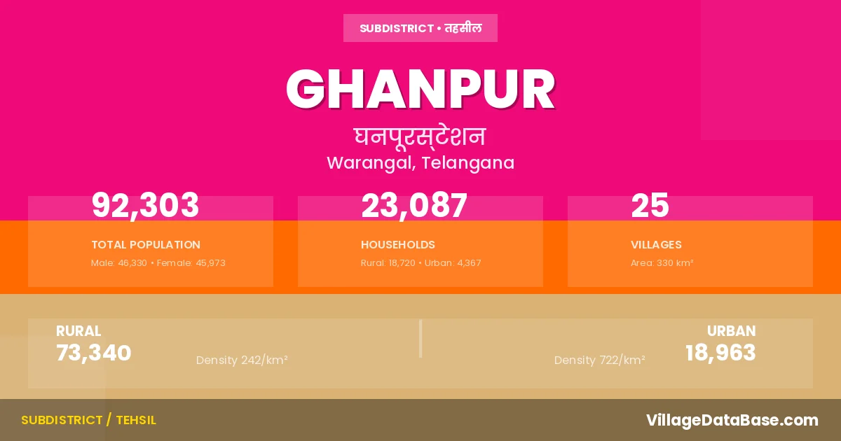 According to the 2011 census The total area of Ghanpur Mandal is 330 km², with a population of 92303 people. The population density is 280 inhabitants per square kilometre, and there are approximately 23087 houses in the sub district.