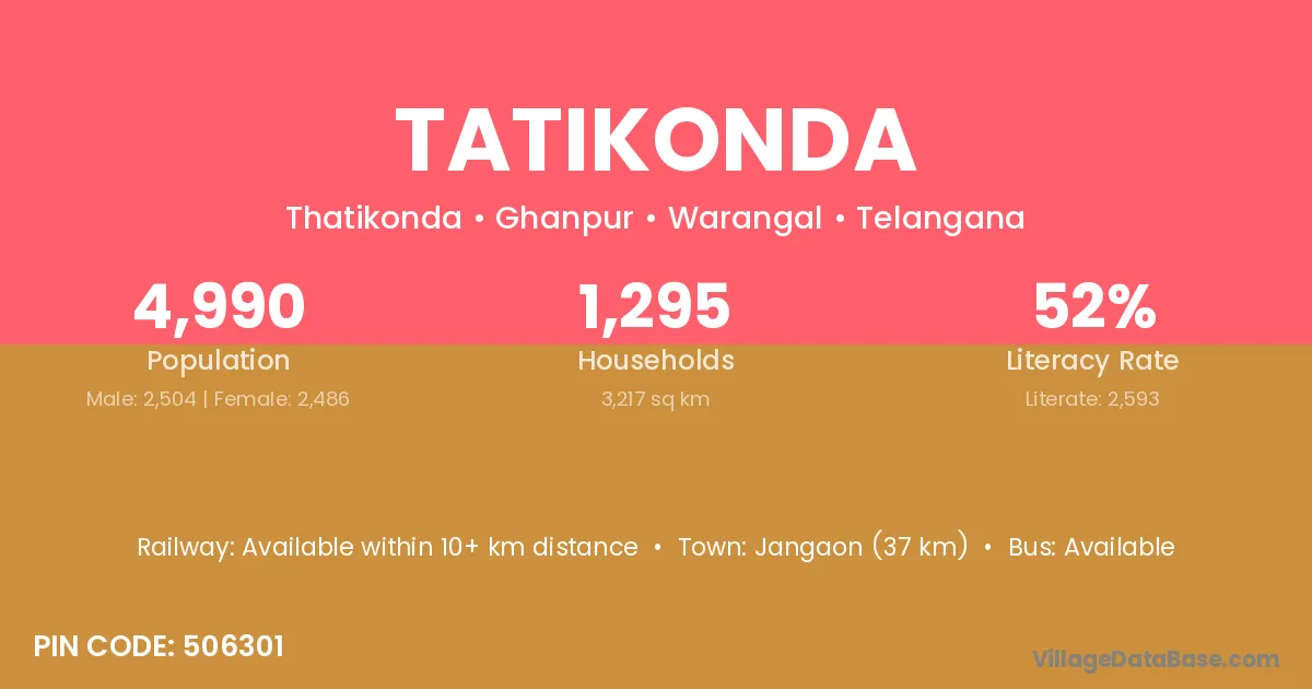 Jangaon (37 km) is the nearest town to Tatikonda village for major economic activities and is located approximately 37 km away.