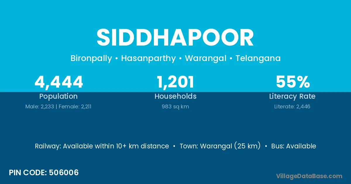 Warangal (25 km) is the nearest town to Siddhapoor village for major economic activities and is located approximately 25 km away.