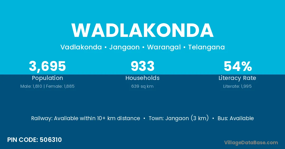 Jangaon (3 km) is the nearest town to Wadlakonda village for major economic activities and is located approximately 3 km away.