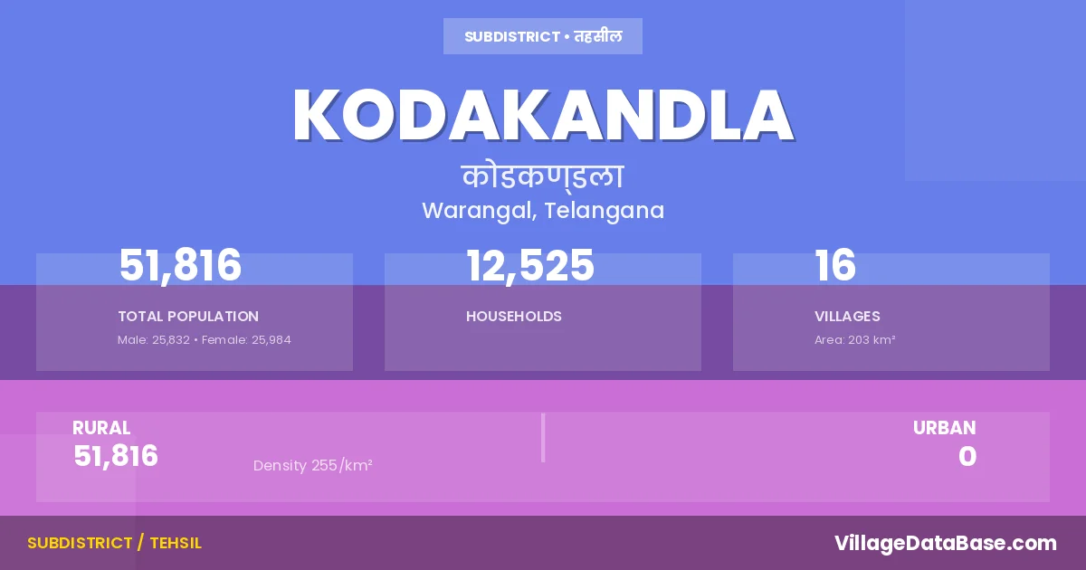 According to the 2011 census The total area of Kodakandla Mandal is 203 km², with a population of 51816 people. The population density is 255 inhabitants per square kilometre, and there are approximately 12525 houses in the sub district.