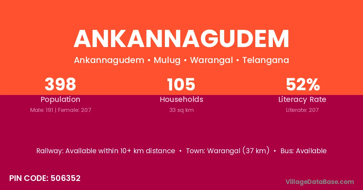 Warangal (87 km) is the nearest town to Ankannagudem village for major economic activities and is located approximately 87 km away.