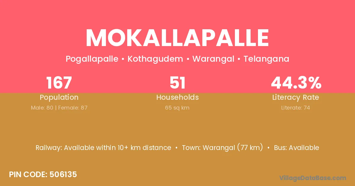 Warangal (77 km) is the nearest town to Mokallapalle village for major economic activities and is located approximately 77 km away.