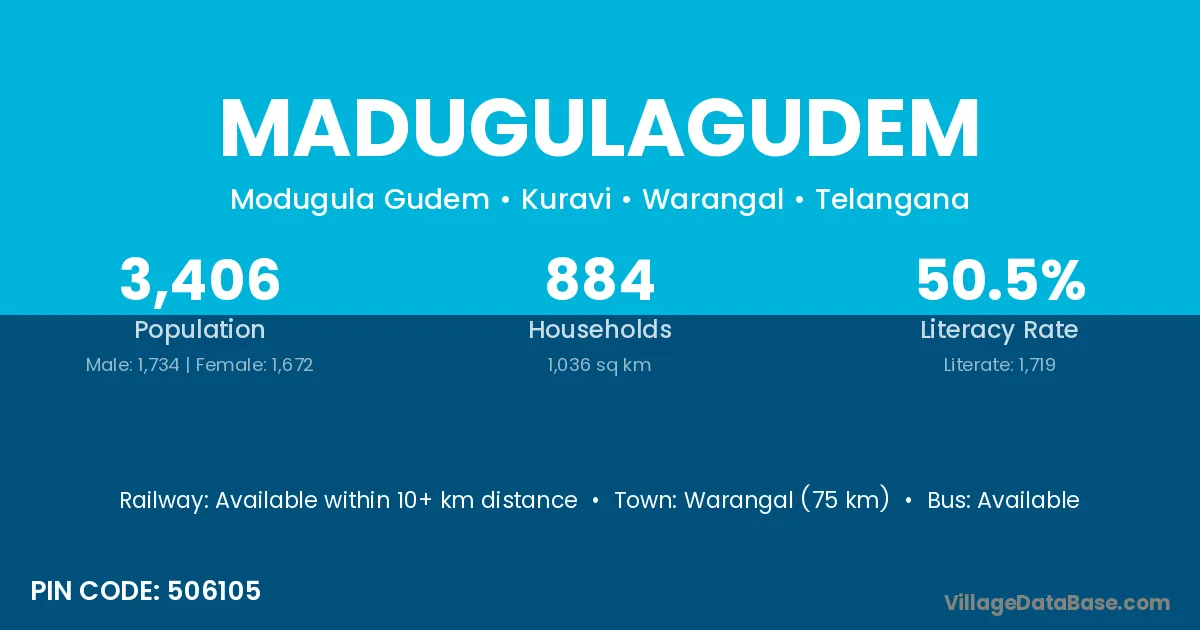Warangal (75 km) is the nearest town to Madugulagudem village for major economic activities and is located approximately 75 km away.