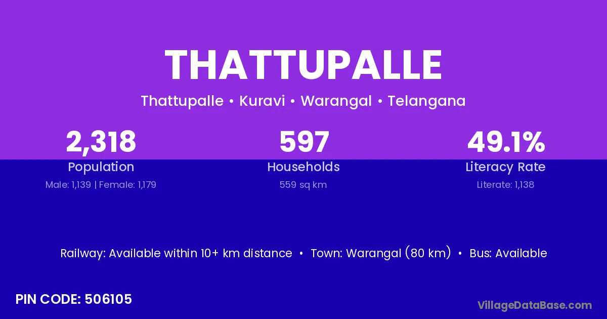Warangal (80 km) is the nearest town to Thattupalle village for major economic activities and is located approximately 80 km away.