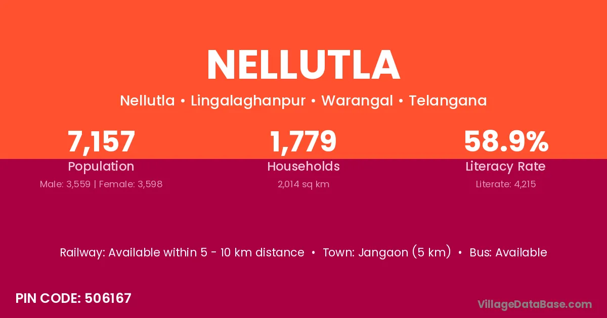 Jangaon (5 km) is the nearest town to Nellutla village for major economic activities and is located approximately 5 km away.