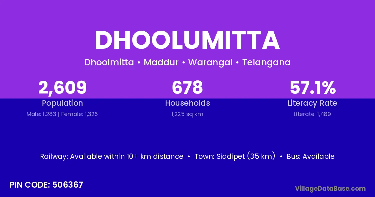 Siddipet (35 km) is the nearest town to Dhoolumitta village for major economic activities and is located approximately 35 km away.