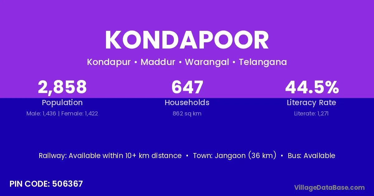 Jangaon (36 km) is the nearest town to Kondapoor village for major economic activities and is located approximately 36 km away.