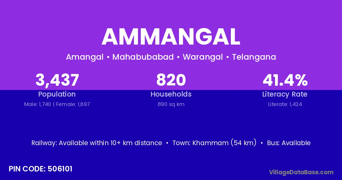 Ammangal village has a total population of 3,437 people, of which 1,740 are males and 1,697 are females.
