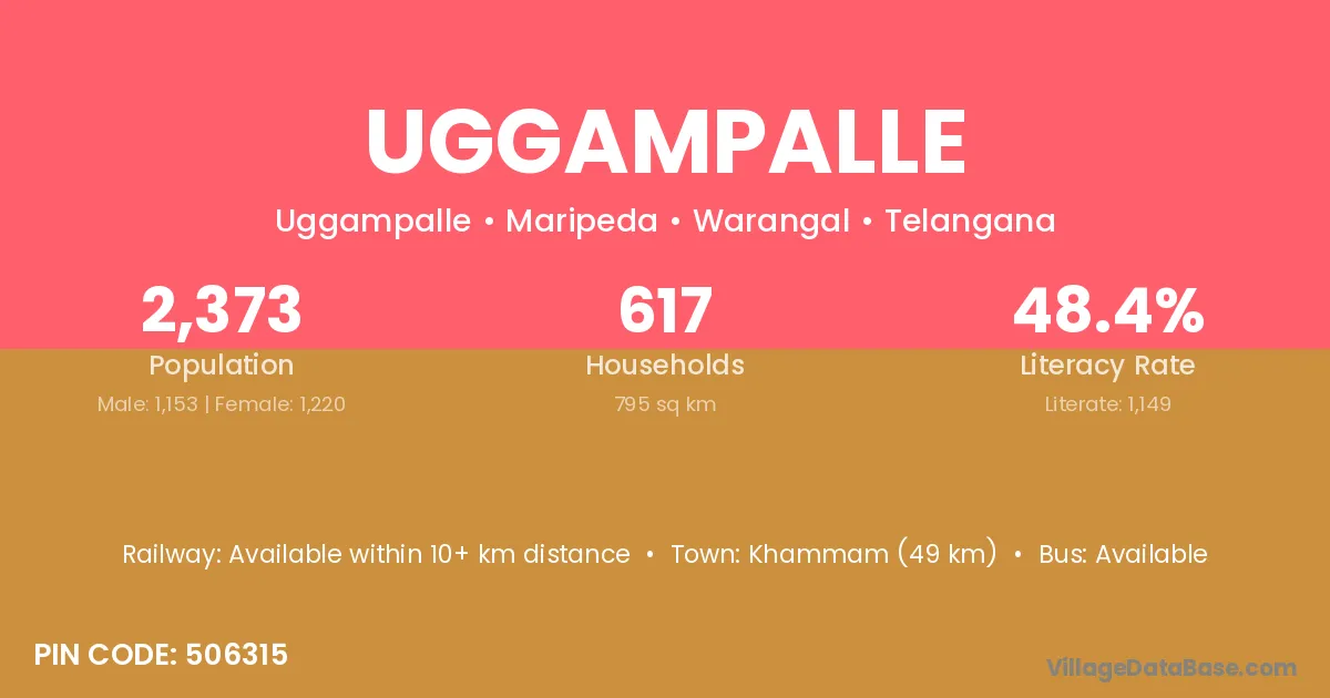 Khammam (49 km) is the nearest town to Uggampalle village for major economic activities and is located approximately 49 km away.