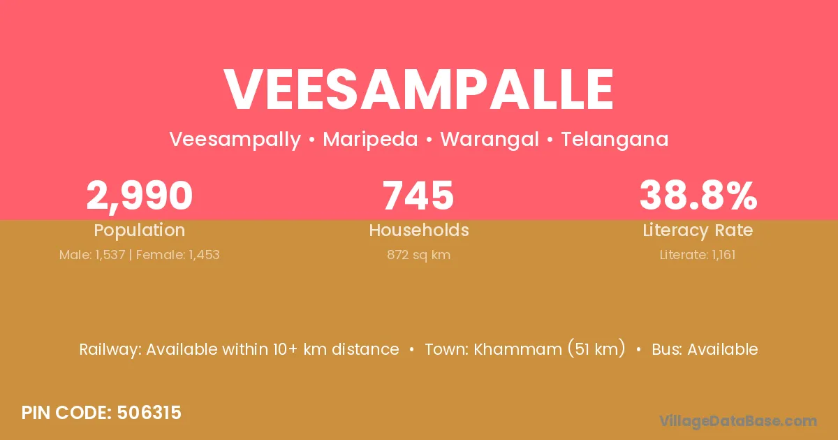 Khammam (51 km) is the nearest town to Veesampalle village for major economic activities and is located approximately 51 km away.