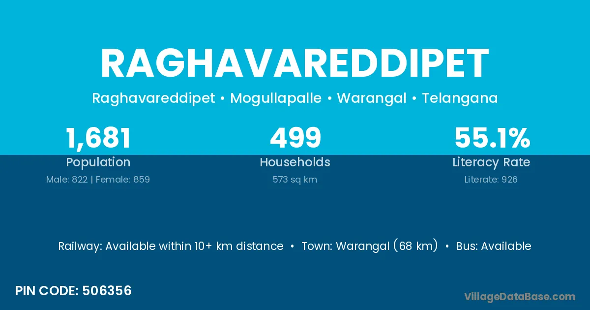 Warangal (68 km) is the nearest town to Raghavareddipet village for major economic activities and is located approximately 68 km away.