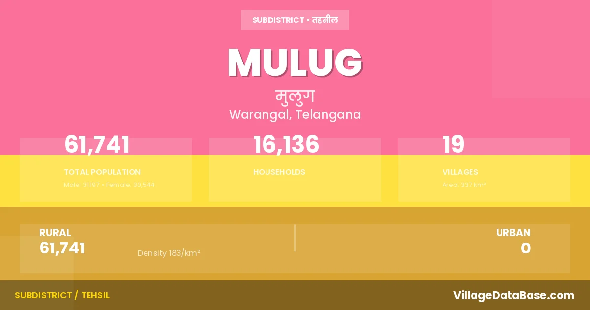 According to the 2011 census The total area of Mulug Mandal is 337 km², with a population of 61741 people. The population density is 183 inhabitants per square kilometre, and there are approximately 16136 houses in the sub district.