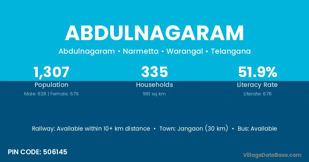 Jangaon (30 km) is the nearest town to Abdulnagaram village for major economic activities and is located approximately 30 km away.