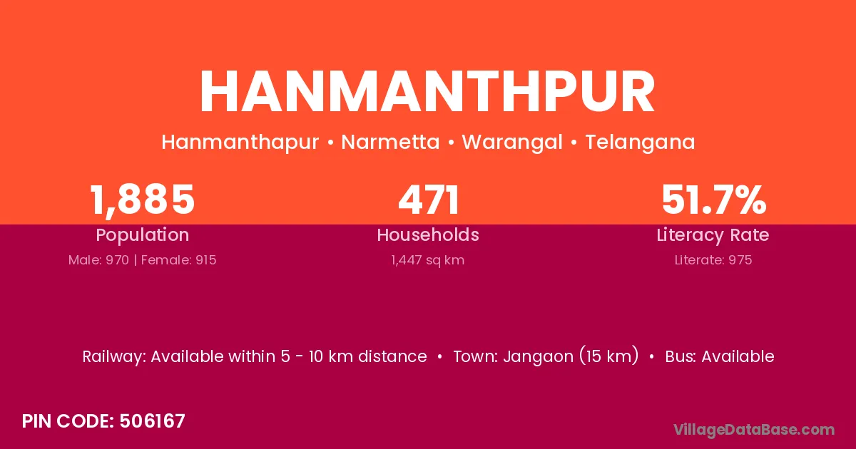 Jangaon (15 km) is the nearest town to Hanmanthpur village for major economic activities and is located approximately 15 km away.