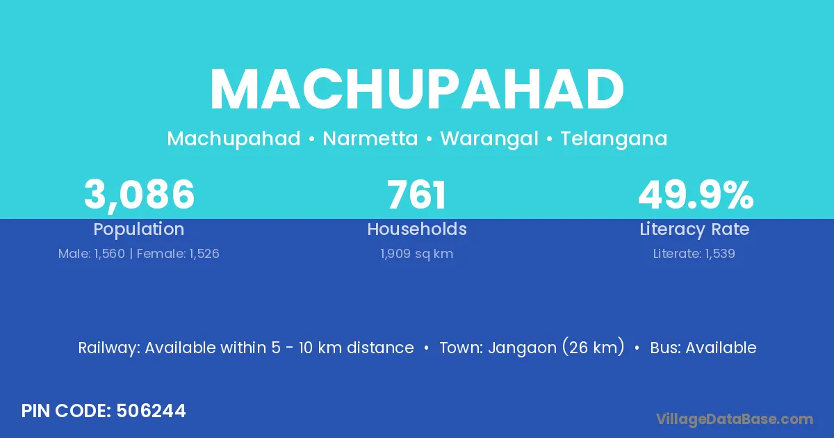 Jangaon (26 km) is the nearest town to Machupahad village for major economic activities and is located approximately 26 km away.