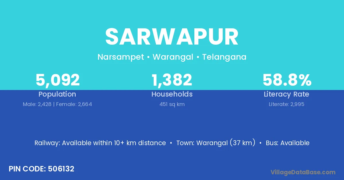 Warangal (37 km) is the nearest town to Sarwapur village for major economic activities and is located approximately 37 km away.