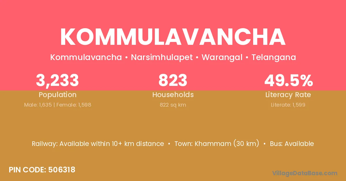 Khammam (30 km) is the nearest town to Kommulavancha village for major economic activities and is located approximately 30 km away.