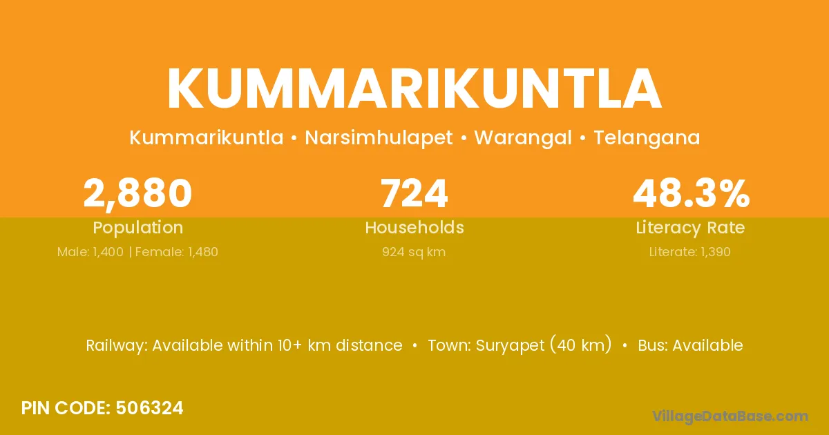 Suryapet (40 km) is the nearest town to Kummarikuntla village for major economic activities and is located approximately 40 km away.