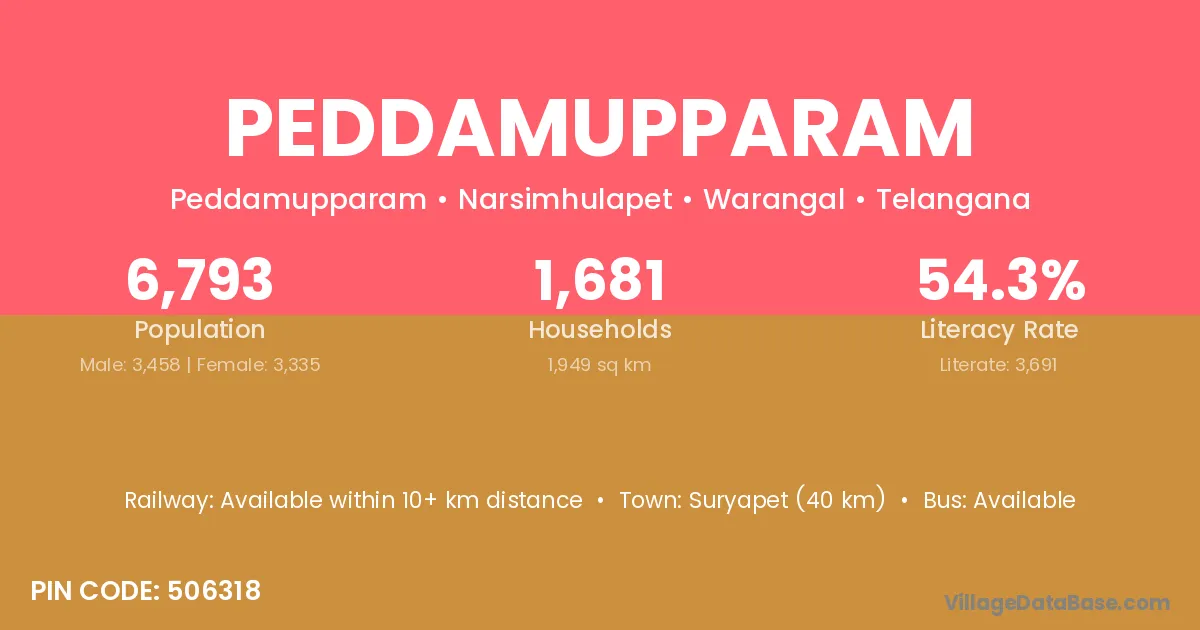 Suryapet (40 km) is the nearest town to Peddamupparam village for major economic activities and is located approximately 40 km away.