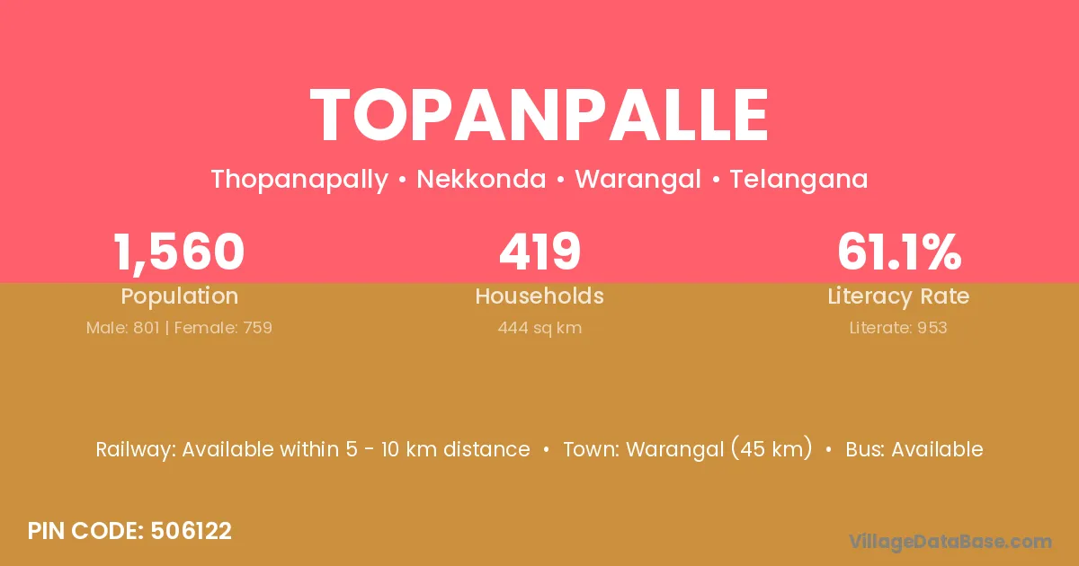 Warangal (45 km) is the nearest town to Topanpalle village for major economic activities and is located approximately 45 km away.