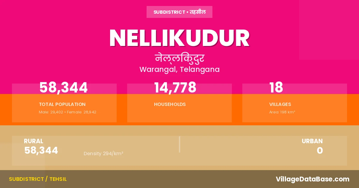 Nellikudur is a town and Mandal in the Warangal district of the Telangana. In India, a Mandal is a subdivision of a district responsible for the administration and revenue collection of a specific area within the district. Mandals play a crucial role in the local governance structure, contributing significantly to the development and administration of their communities.