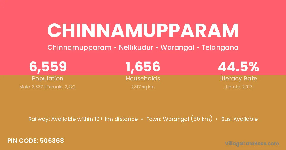 Warangal (80 km) is the nearest town to Chinnamupparam village for major economic activities and is located approximately 80 km away.
