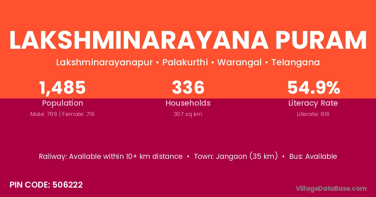 Jangaon (35 km) is the nearest town to Lakshminarayana Puram village for major economic activities and is located approximately 35 km away.