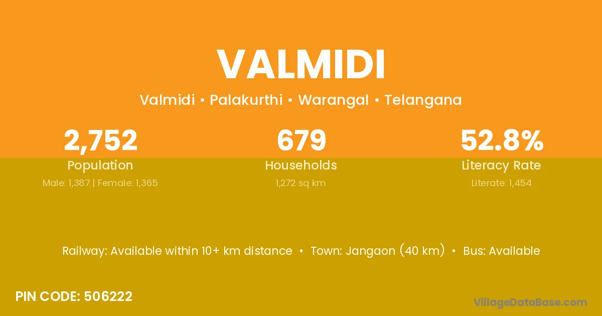 Jangaon (40 km) is the nearest town to Valmidi village for major economic activities and is located approximately 40 km away.