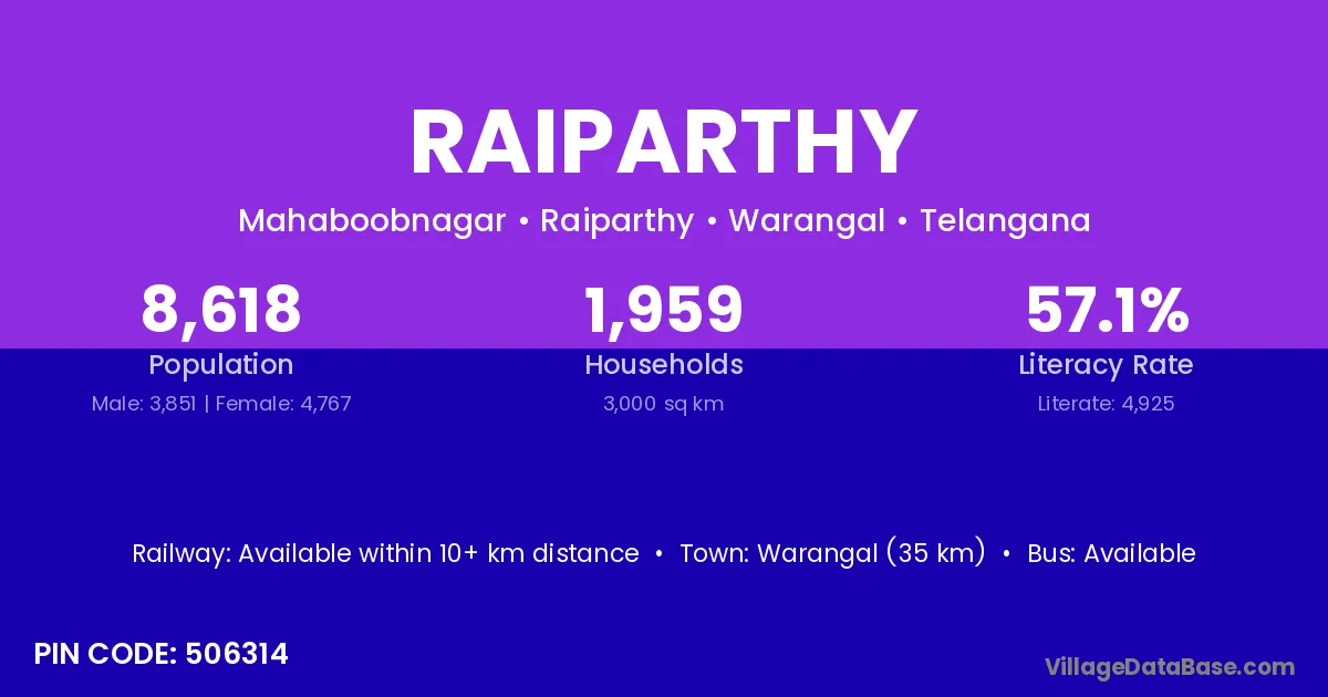Warangal (41 km) is the nearest town to Raiparthy village for major economic activities and is located approximately 41 km away.
