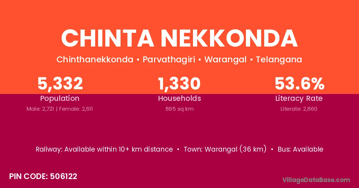 According to Census 2011 information, the village code of Chinta Nekkonda village is 506122.