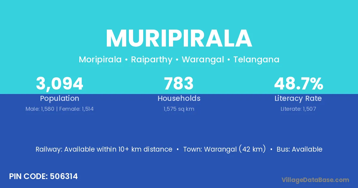 Warangal (42 km) is the nearest town to Muripirala village for major economic activities and is located approximately 42 km away.