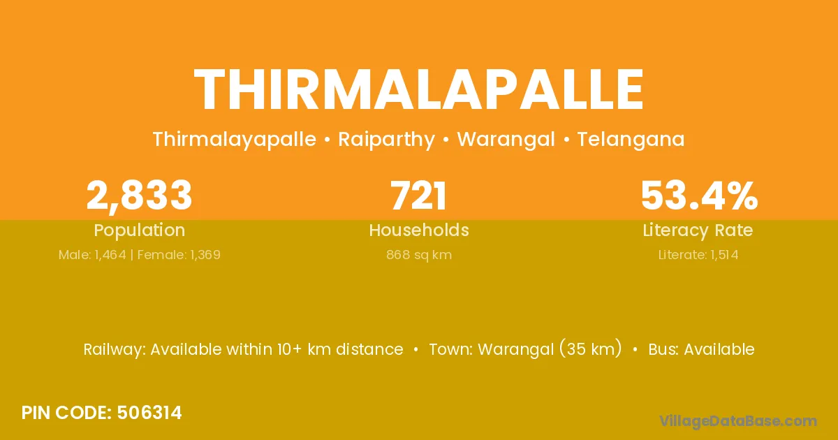 Warangal (35 km) is the nearest town to Thirmalapalle village for major economic activities and is located approximately 35 km away.
