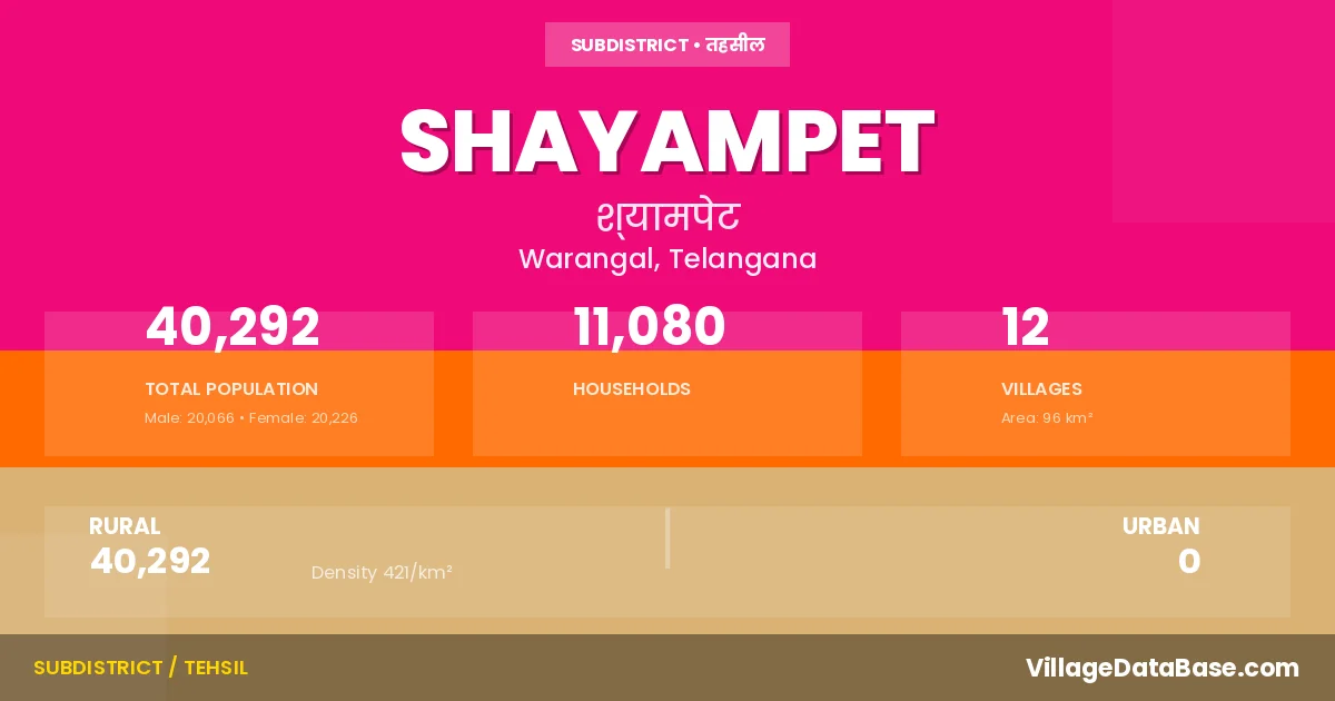 Shayampet is a town and Mandal in the Warangal district of the Telangana. In India, a Mandal is a subdivision of a district responsible for the administration and revenue collection of a specific area within the district. Mandals play a crucial role in the local governance structure, contributing significantly to the development and administration of their communities.