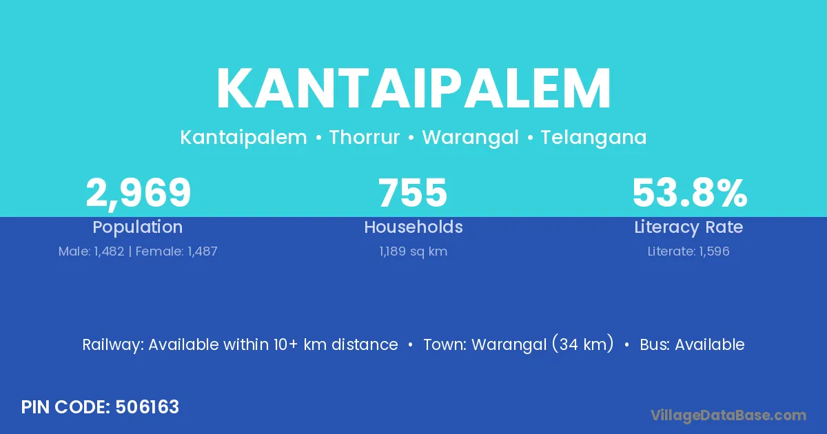 Warangal (34 km) is the nearest town to Kantaipalem village for major economic activities and is located approximately 34 km away.