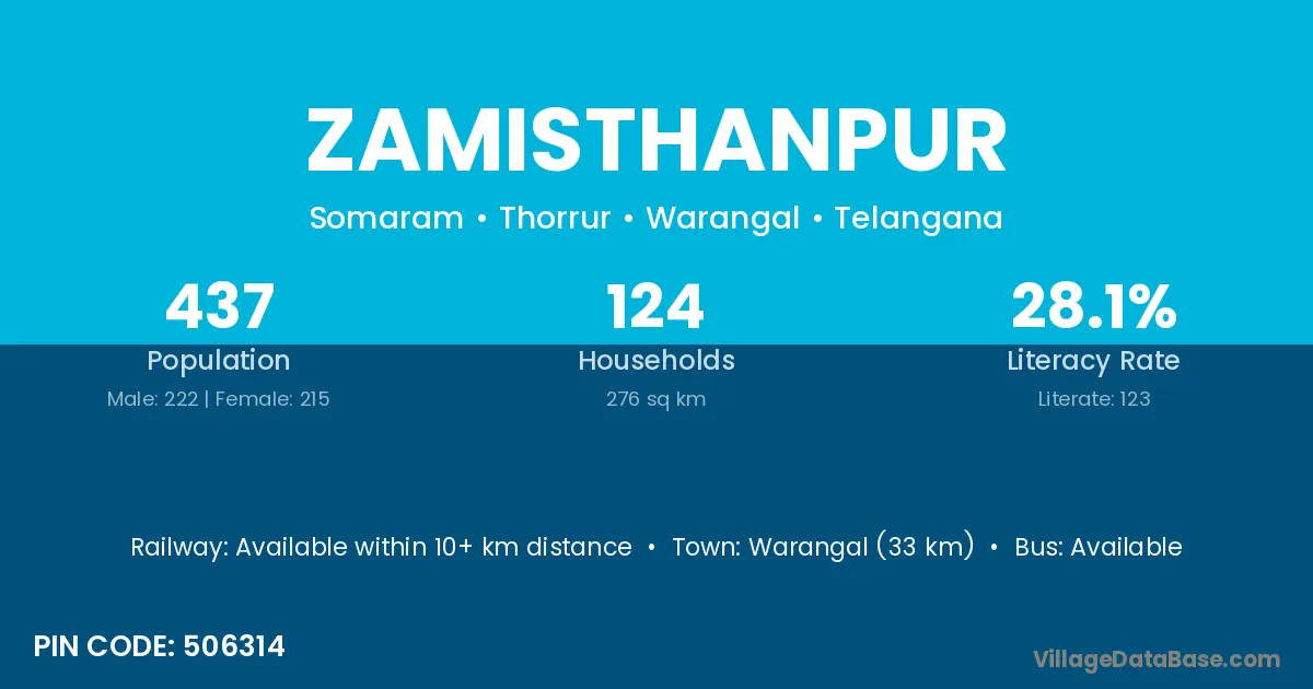 Warangal (33 km) is the nearest town to Zamisthanpur village for major economic activities and is located approximately 33 km away.