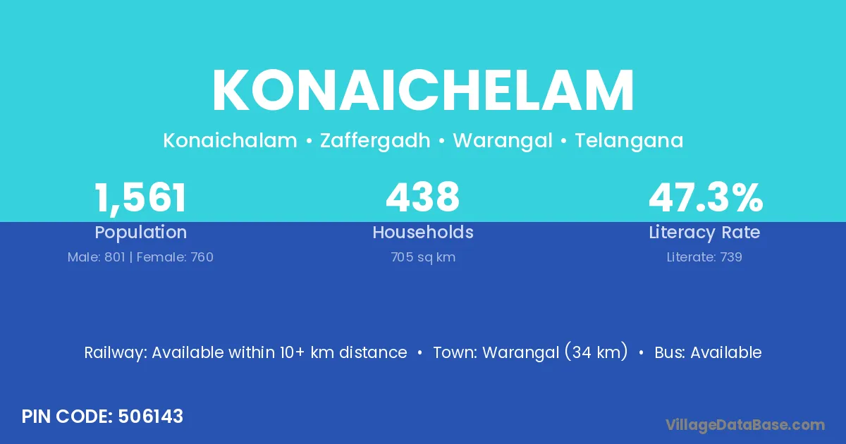 Warangal (34 km) is the nearest town to Konaichelam village for major economic activities and is located approximately 34 km away.