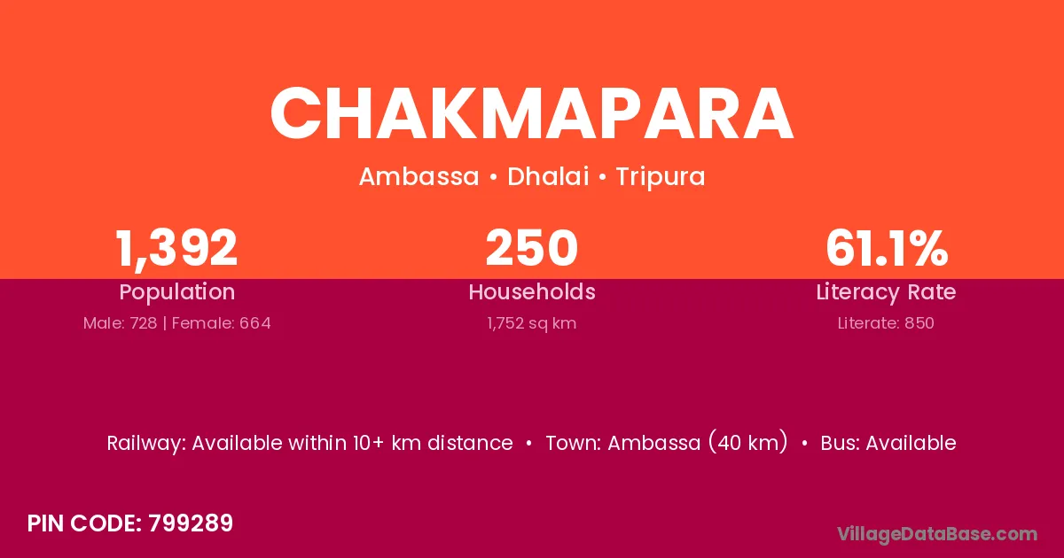 Ambassa (40 km) is the nearest town to Chakmapara village for major economic activities and is located approximately 40 km away.