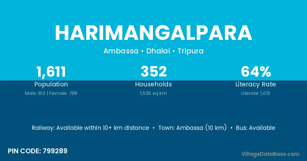Ambassa (10 km) is the nearest town to Harimangalpara village for major economic activities and is located approximately 10 km away.