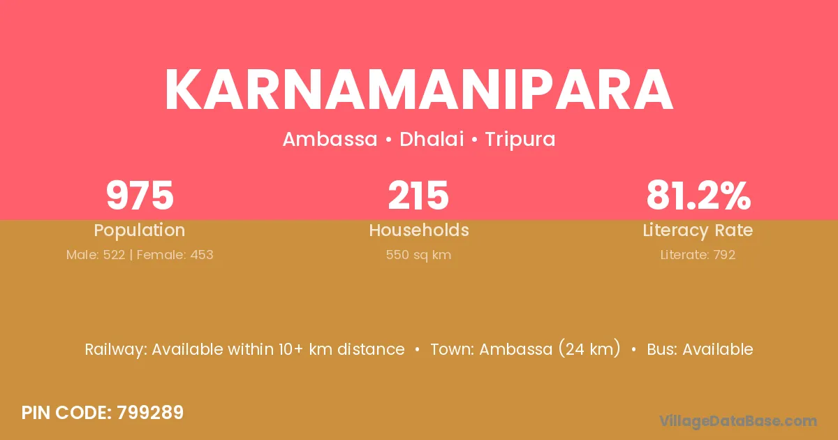 Ambassa (24 km) is the nearest town to Karnamanipara village for major economic activities and is located approximately 24 km away.