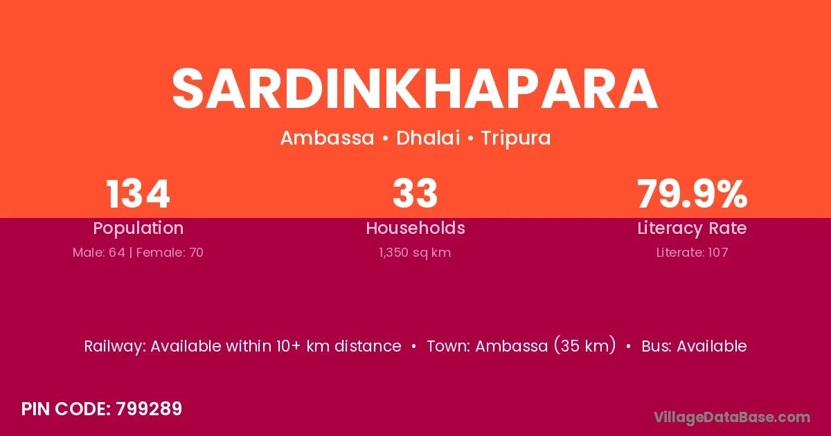 Ambassa (35 km) is the nearest town to Sardinkhapara village for major economic activities and is located approximately 35 km away.
