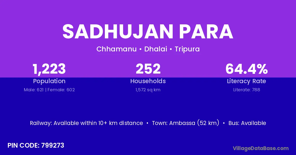 Ambassa (52 km) is the nearest town to Sadhujan Para village for major economic activities and is located approximately 52 km away.